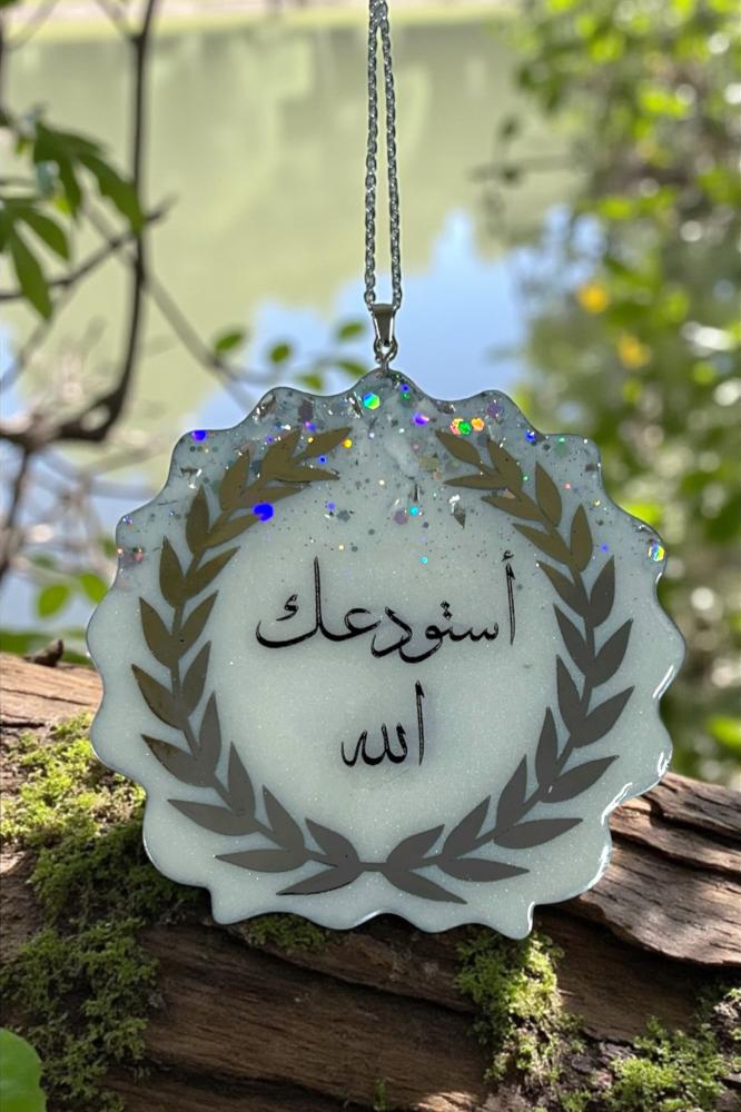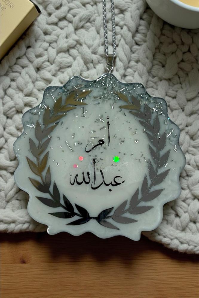 _تعليقة سيارة فخمة من الريزن، مصممة بعناية لتضيف لمسة من الجمال والرقي إلى سيارتك. تتميز باللون الأبيض اللؤلؤي الجميل، مع كتابة باللون الذهبي اللامع واسمك الشخصي._