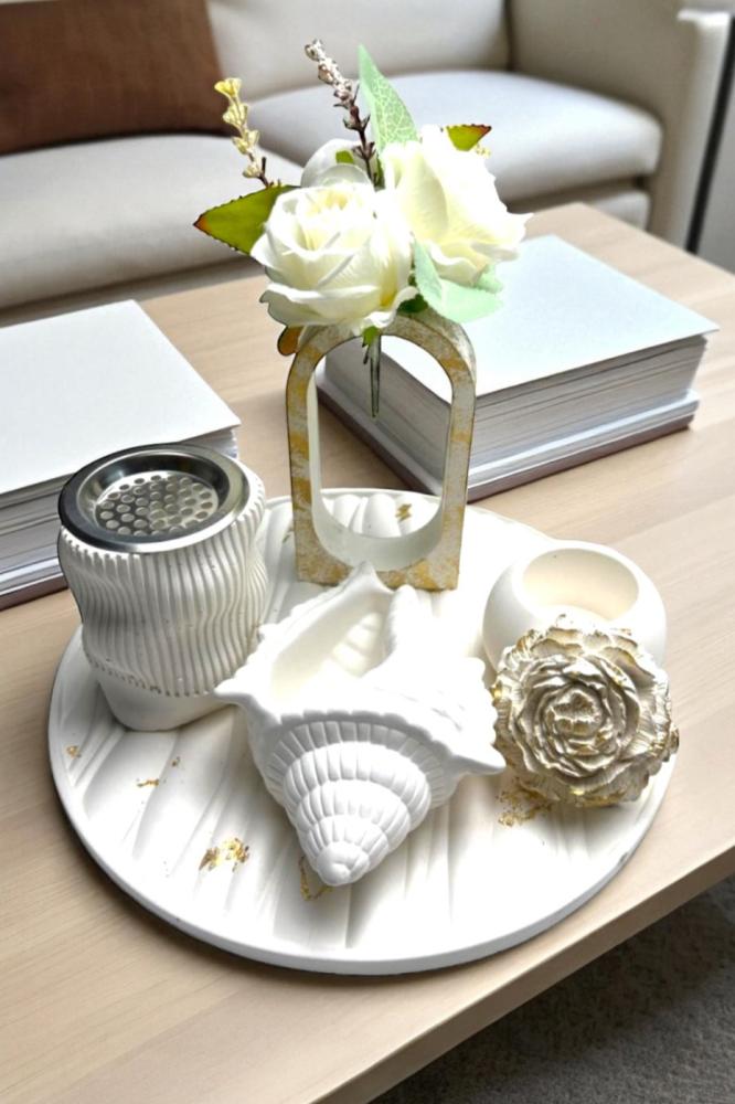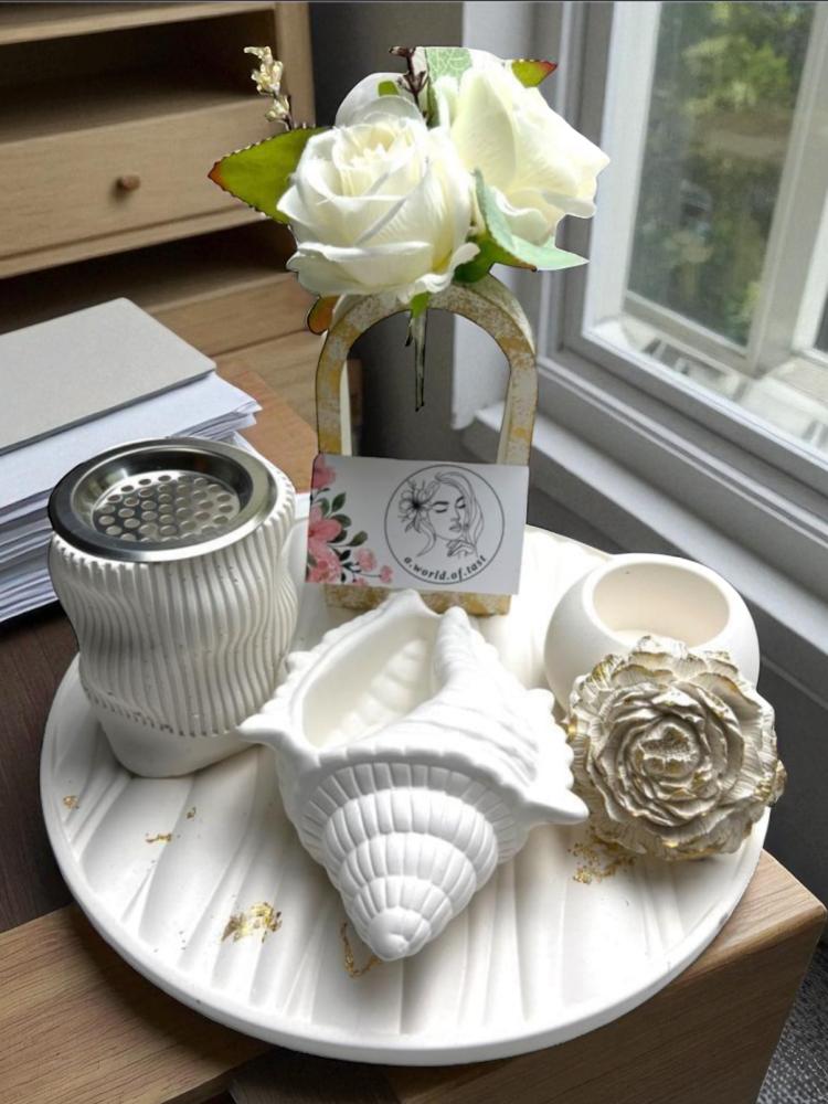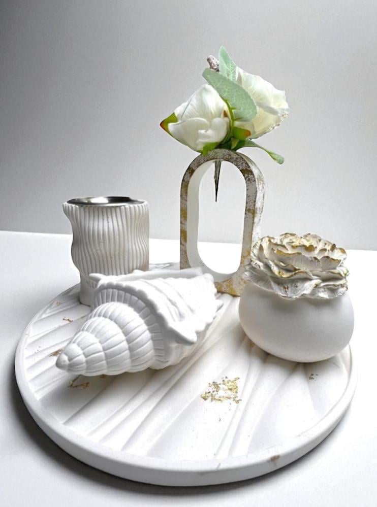 * صينيه دائريه الشكل باللون الابيض وورق الذهب الرائع