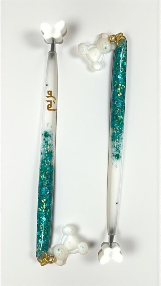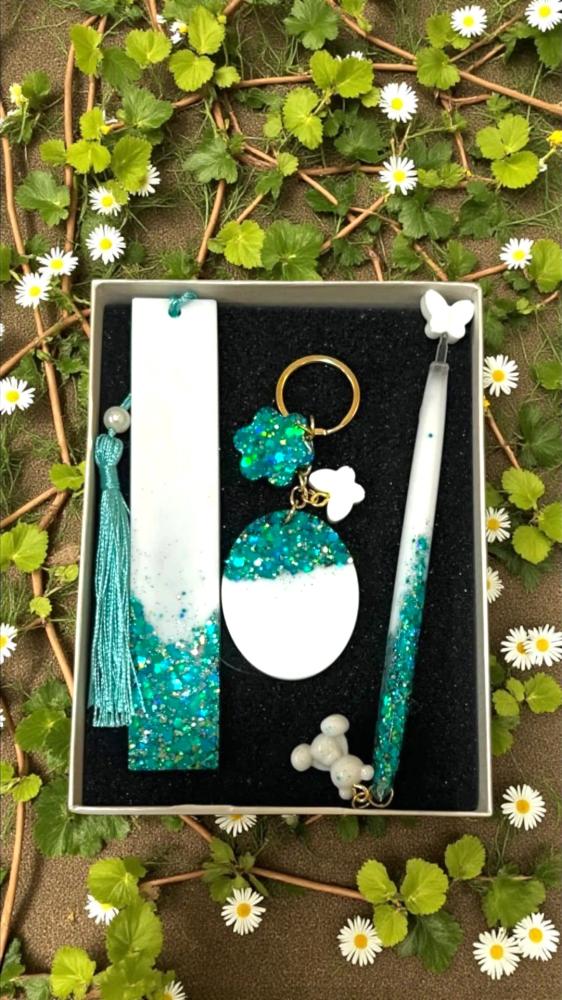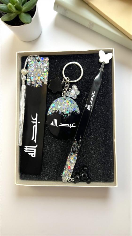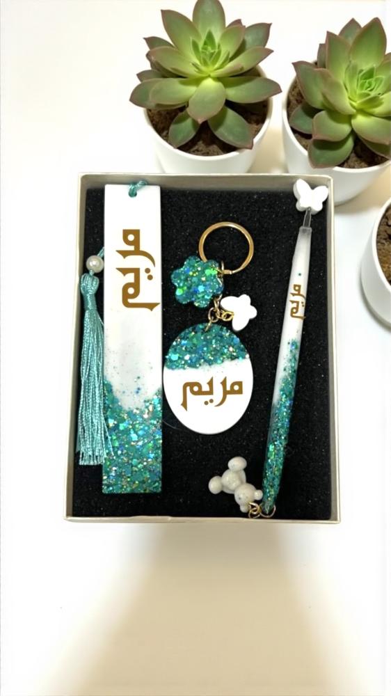 _طقم هدايا مكون من 3 قطع فريدة، مصنوع من الريزن عالي الجودة. يتضمن فاصل كتاب، ميدالية، وقلم، مع إمكانية إضافة الاسم أو العبارة حسب الطلب._