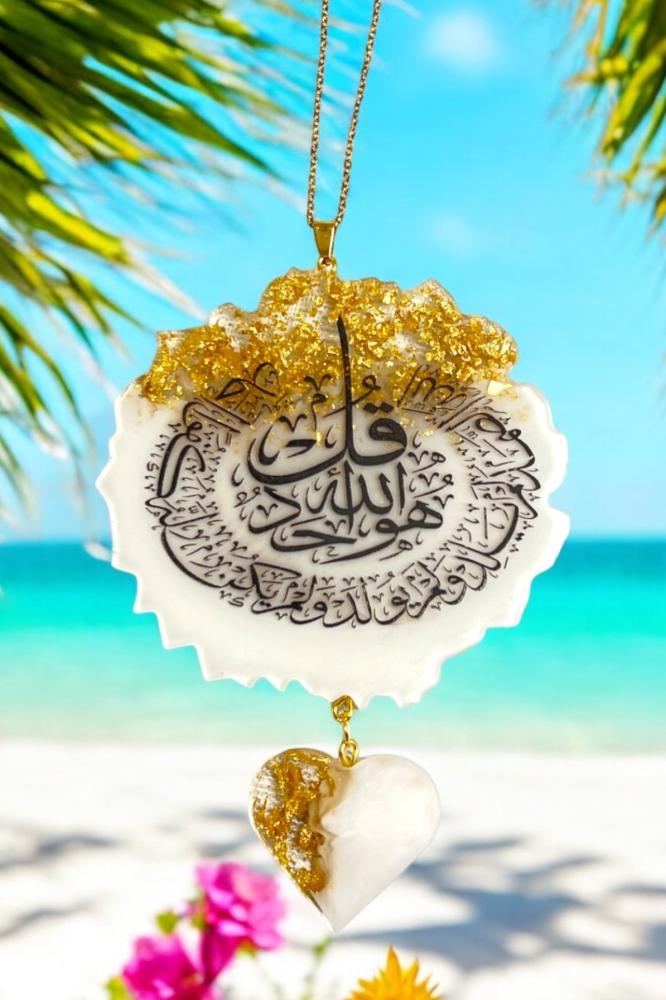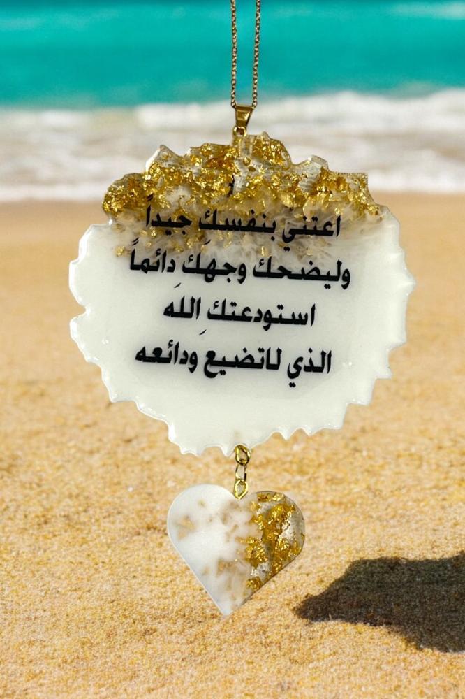 أهدي من تحبين هذه التعليقة الفخمة، المصنوعة من الريزن باللون الأبيض وأوراق الذهب الرائعة، والتي تتدلى منها تعليقة ريزن بنفس التكنيك والألوان على شكل قلب (ويمكن استبدالها بحرف إنجليزي أو نجمة) حسب الطلب.